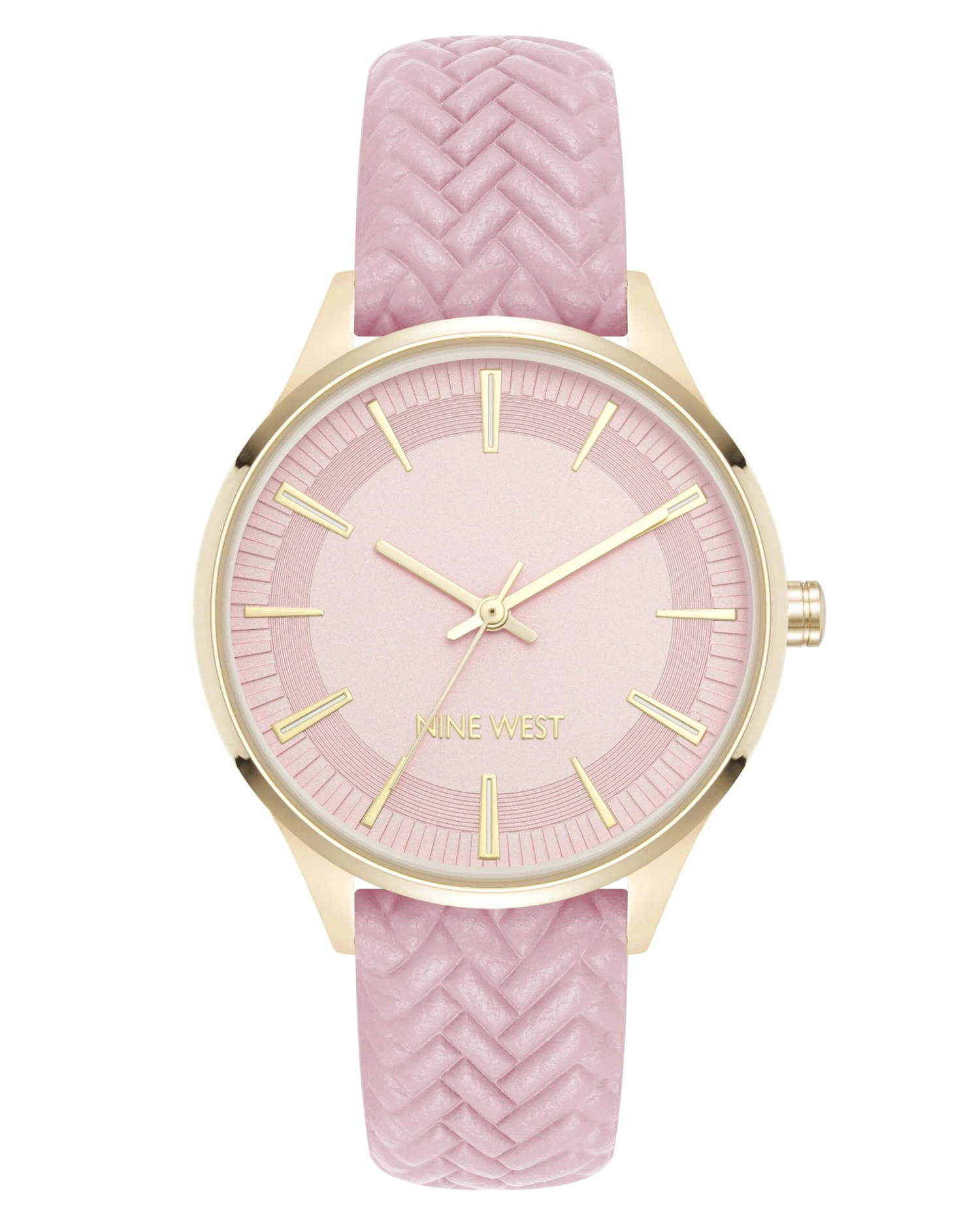 - Chevron patterned faux leather strap with buckle closure